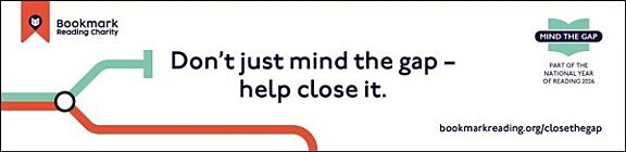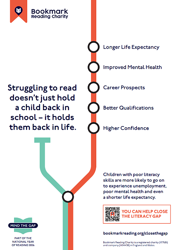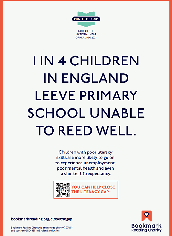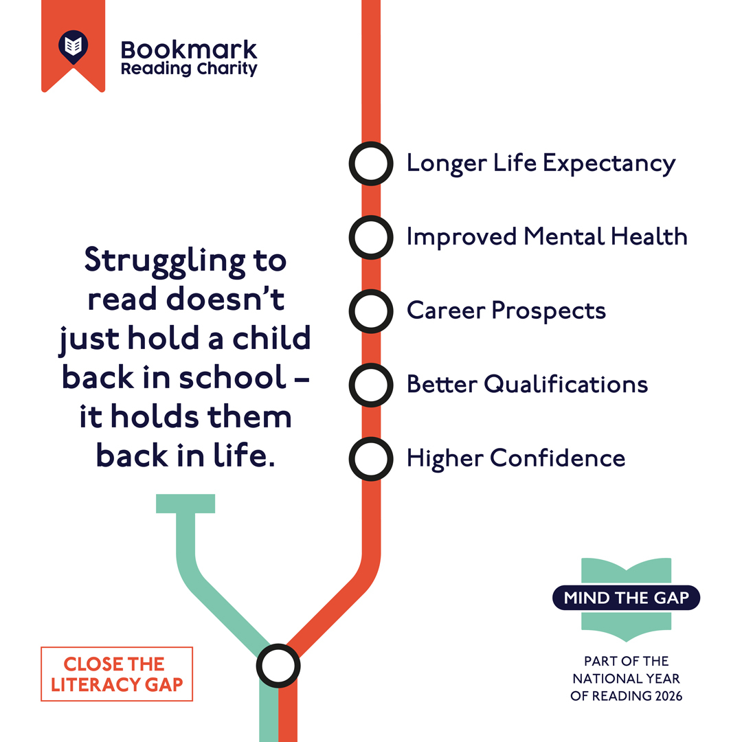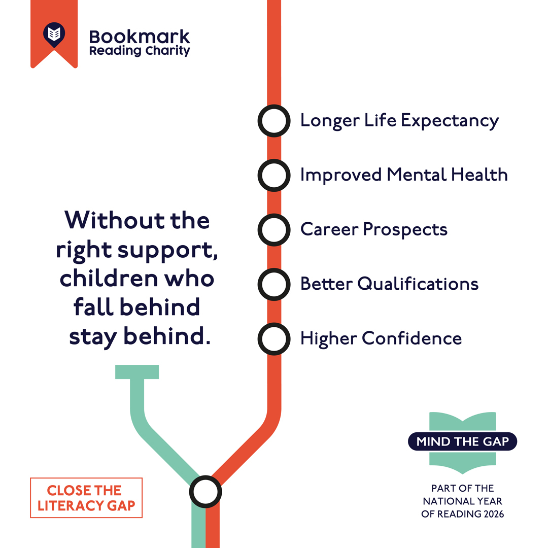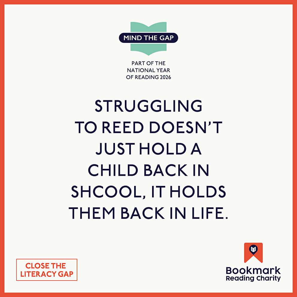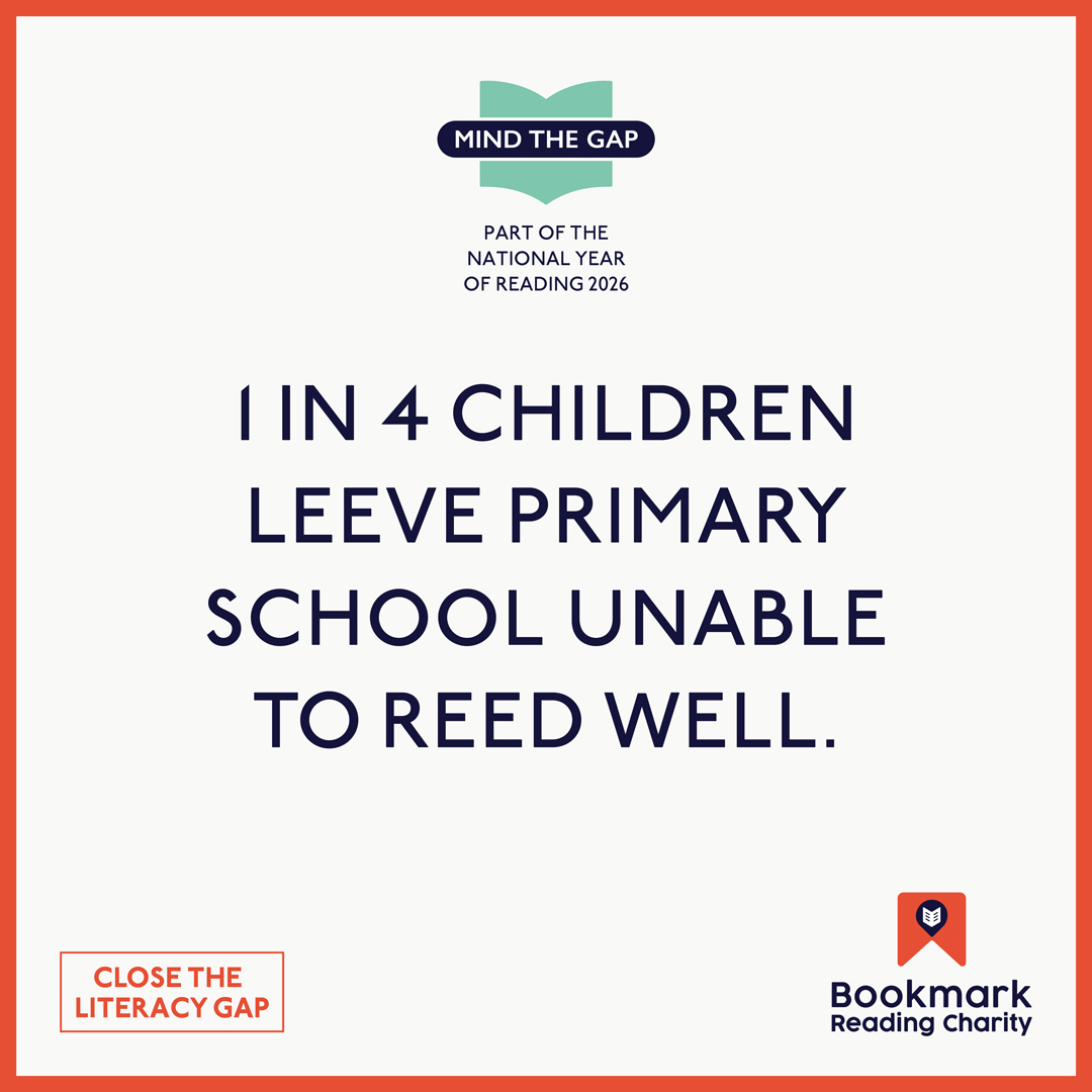 Square graphic for Bookmark Reading Charity’s “Mind the Gap” campaign. Text reads: “1 in 4 children leave primary school unable to read well.”
